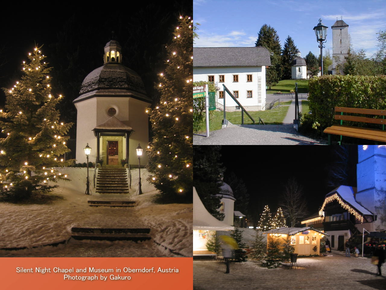 以下の「きよしこの夜」画像は、オーストリアのオーベルンドルフにある「きよしこの夜」のチャペルとミュージアム画像。画像にマウスオーバーする(カーソルを画像の上に置く)と、3枚の建物画像に入れ替わります。画像をクリックすると、1280x960ピクセルに拡大します。「きよしこの夜-Wikipedia」から引用した「きよしこの夜」画像をフルサイズ大画面でご覧下さい!