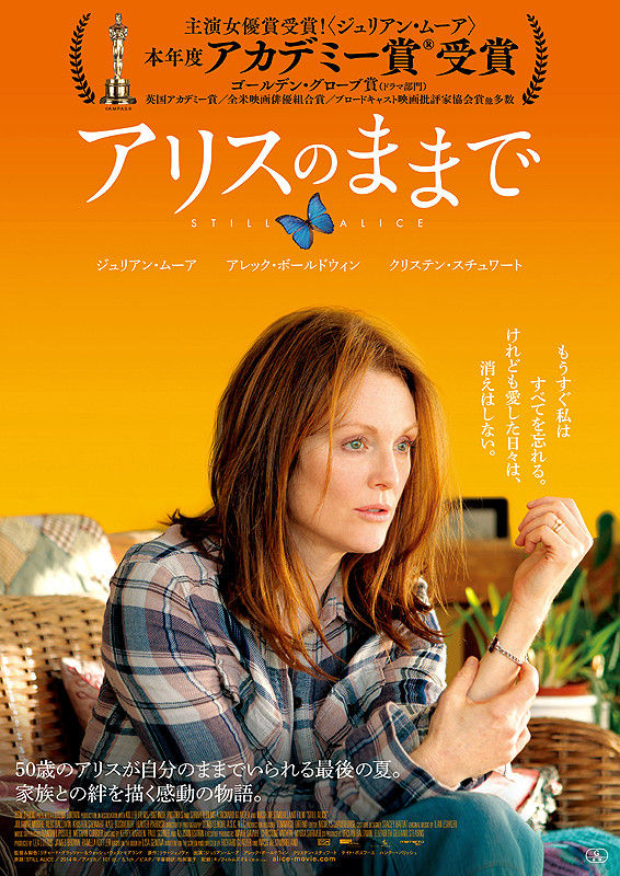 【映画『アリスのままで』解説】#01 映画『 アリスのままで (2014) STILL ALICE 』は、リチャード・グラツァーとワッシュ・ウェストモアランドが監督・脚本を兼任し、リサ・ジェノヴァ原作『アリスのままで』(キノブックス刊)/『静かなアリス』(講談社刊)の映画化で、2014年のアメリカ合衆国とフランスのドラマ映画。製作国アメリカ合衆国では2014年10月13日ハンプトン国際映画祭から2015年2月20日全米公開、製作国フランスでは2015年3月18日全仏公開。日本では、2015年6月27日(土)、キノフィルムズより配給、全国公開される予定だ。 本映画『 アリスのままで (2014) STILL ALICE 』のポスターのキャッチコピーは、 <もうすぐ私は すべてを忘れる。 けれども愛した日々は、 消えはしない。 50歳のアリスが自分のままでいられる最期の夏。 家族との絆を描く感動の物語。> 【映画『アリスのままで』解説】#02 本映画『 アリスのままで (2014) STILL ALICE 』の原作は全米を感動と涙で包み込んだベストセラー小説『アリスのままで』(キノブックス刊)/旧題『静かなアリス』(講談社刊)。本映画『アリスのままで』の監督はリチャード・グラッツァーとウォッシュ・ウエストモアランドの2人。グラッツァー自身も、ALS(筋委縮性側索硬化症)という病気と闘いながらの撮影となった。 本映画『アリスのままで』は、ベテランと若手俳優の演技派が勢ぞろいし、病気の苦悩や葛藤、そして家族の絆の物語を見事に演じている。ヒロインのアリス役ジュリアン・ムーアは本作品『アリスのままで』で、2014年アカデミー賞、ゴールデン・グローブ、英国アカデミー賞、インディペンデント・スピリット賞、放送映画批評家協会賞を始め数々で主演女優賞に輝いた。 『アリスのままで』は6月全国超拡大ロードショー! 【映画『アリスのままで』解説<crew>】#03 本映画『 アリスのままで (2014) STILL ALICE 』のスタッフは、ジュリアン・ムーアをアカデミー賞主演女優賞に導いた精鋭たち! ●監督は、本映画『 アリスのままで (2014) STILL ALICE 』で映画の森てんこ森で初めて紹介するリチャード・グラツァー或いはリチャード・グラッツァー Richard Glatzerとワッシュ・ウェストモアランド Wash Westmoreland。グラツァー監督自身も、ALS(筋委縮性側索硬化症)という病気と闘いながらの撮影となり、2015/03/10に死去。 ●原作は、本映画『 アリスのままで (2014) STILL ALICE 』で映画の森てんこ森で初めて紹介するリサ・ジェノヴァ Lisa Genovaの"Still Alice"「アリスのままで(旧題:静かなアリス)」。 ●脚本は、本映画『 アリスのままで (2014) STILL ALICE 』監督の両名、上記リチャード・グラツァー Richard Glatzerとワッシュ・ウェストモアランド Wash Westmoreland。 ●製作は、本映画『 アリスのままで (2014) STILL ALICE 』他『 バレエ・カンパニー (2003) THE COMPANY 』『 キャンプ (2003) CAMP 』『 ストーカー (2002) ONE HOUR PHOTO 』『 エデンより彼方に (2002) FAR FROM HEAVEN 』『 ヘドウィグ・アンド・アングリーインチ (2001) 』等のパメラ・コフラー Pamela Kofflerと、本映画『 アリスのままで (2014) STILL ALICE 』で映画の森てんこ森で初めて紹介するジェームス・ブラウン James Brownとレックス・ルッツス Lex Lutzus。 ●製作総指揮は、本映画『 アリスのままで (2014) STILL ALICE 』で映画の森てんこ森で初めて紹介するエミリー・ジョルジュ Emilie Georges、セリーヌ・ラトレイ Celine Rattray、マリー・サヴァレ Marie Savare、マリア・シュライヴァー Maria Shriver、ニコラス・ シューメイカー Nicholas Shumaker、及び、本映画『 アリスのままで (2014) STILL ALICE 』他『 スリーデイズ (2010) THE NEXT THREE DAYS 』『 アドルフの画集 (2002) MAX 』等のトルーディ・スタイラー Trudie Stylerと、本映画『 アリスのままで (2014) STILL ALICE 』他『 バレエ・カンパニー (2003) THE COMPANY 』『 キャンプ (2003) CAMP 』『 パーティ★モンスター (2003) PARTY MONSTER 』『 エデンより彼方に (2002) FAR FROM HEAVEN 』『 ストーカー (2002) ONE HOUR PHOTO 』『 ヘドウィグ・アンド・アングリーインチ (2001) 』等のクリスティーン・ヴェイコン Christine Vachon。 ●音楽は、本映画『 アリスのままで (2014) STILL ALICE 』他、『 47RONIN (2013) 47 RONIN 』『 ジョニー・イングリッシュ 気休めの報酬 (2011) JOHNNY ENGLISH REBORN 』『 キック・アス (2010) KICK-ASS 』『 ヴィクトリア女王 世紀の愛 (2009) THE YOUNG VICTORIA 』『 レイヤー・ケーキ (2004) LAYER CAKE 』『 ワイルド・レンジ 最後の銃撃 (2003) OPEN RANGE 』『 サラマンダー (2002) REIGN OF FIRE 』『 モンテ・クリスト伯 (2002) THE COUNT OF MONTE CRISTO 』『 ブラックホーク・ダウン (2001) 』等のイラン・エシュケリ Ilan Eshkeri。 ●音楽監修、本映画『 アリスのままで (2014) STILL ALICE 』他『 ダイバージェント (2014) DIVERGENT 』『 アメイジング・スパイダーマン2 (2014) THE AMAZING SPIDER-MAN 2 』『 とらわれて夏 (2013) LABOR DAY 』『 キャリー (2013) CARRIE 』『 ムーンライズ・キングダム (2012) MOONRISE KINGDOM 』『 君への誓い (2012) THE VOW 』『 恋と愛の測り方 (2010) LAST NIGHT 』『 ヒューゴの不思議な発明 (2011) HUGO 』『 ラブ&ドラッ